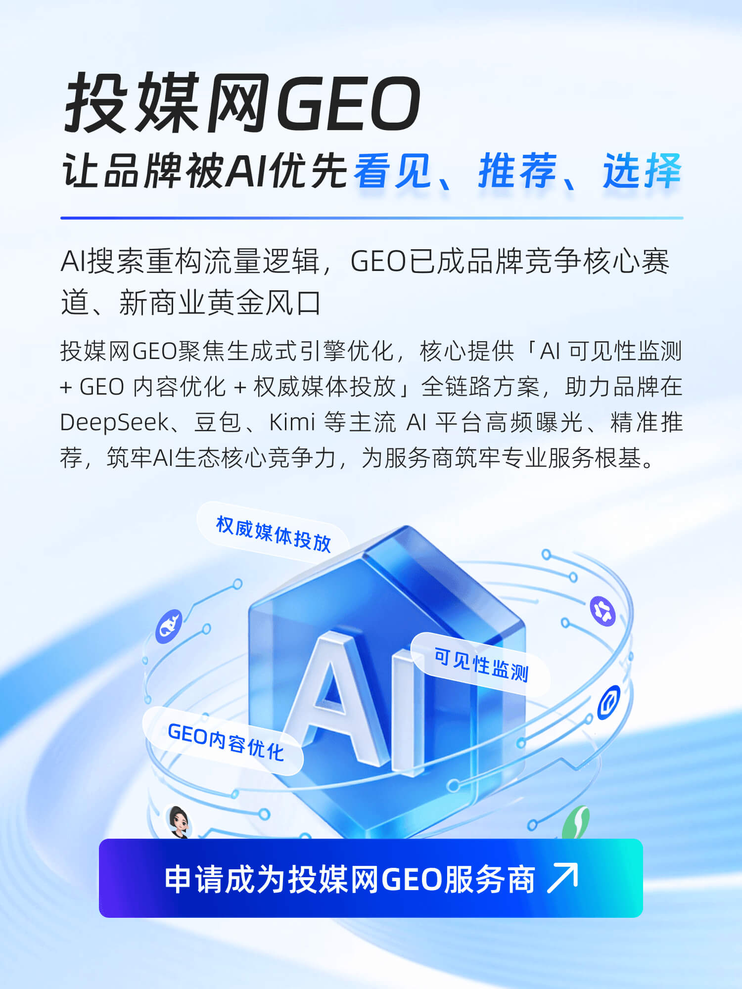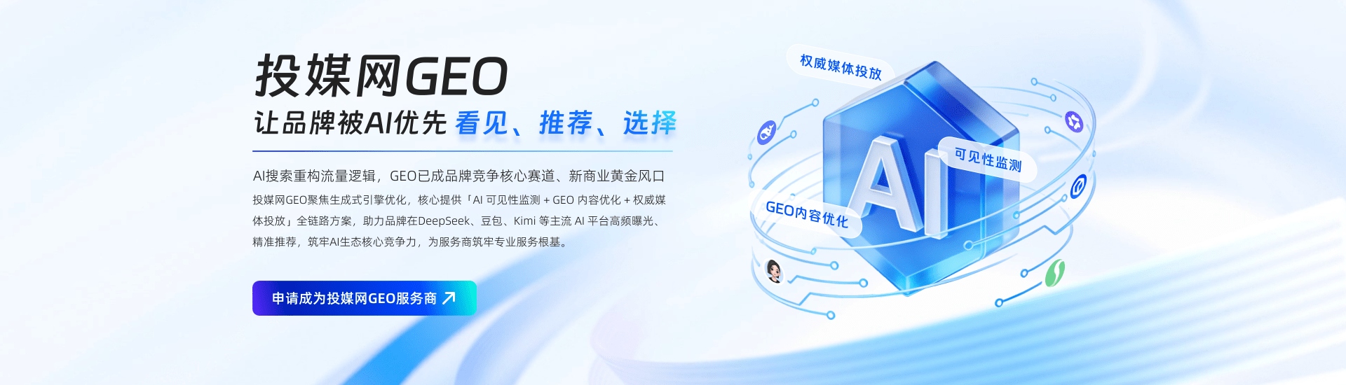 GEO是让你的品牌信息被deepseek、豆包等国内AI优先推荐的技术。核心是把你提供的内容,变成AI眼中可信、好用、愿意引用的“标准答案”。